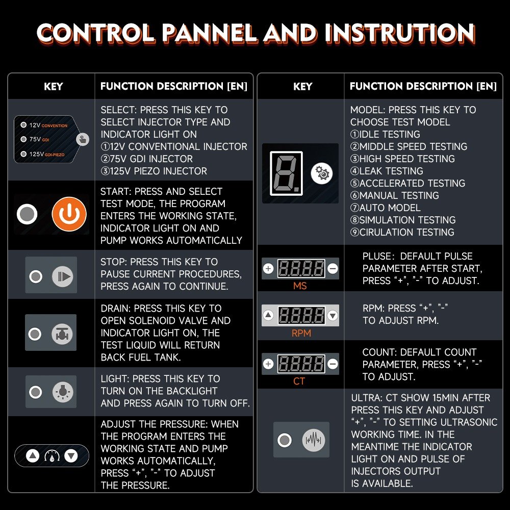 - 【Smart Design】 Come with high-definition digital control panel display, easy to operate and learn. With the help of the bright LED background light, you can clearly observe the various working conditions of the fuel injector. Equipped with a test liquid discharge valve, the content of the test liquid can be clearly observed. It can also be recycled and reused.